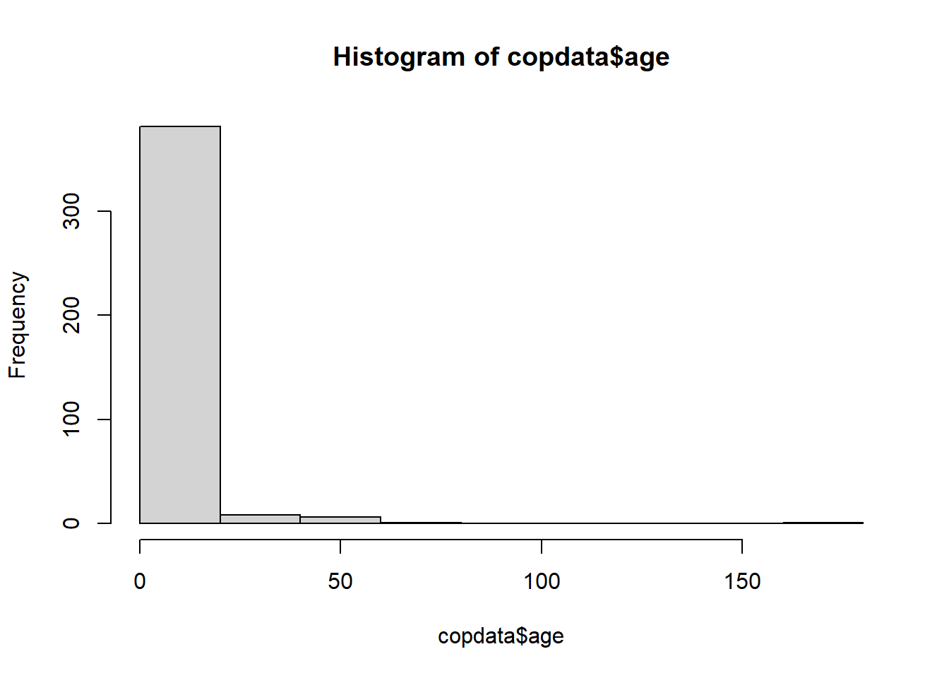 # Update incorrect ages to the correct values with case_when: copdata <- copdata %>%mutate(age =case_when( # Where respondent is 16 and a teacher, change age to 61: age ==16& group =="teacher"~61, # where respondent is 8 or 180 and a student, change age to 18: age ==8& group =="student"~18, age ==180& group =="student"~18, # Keep remaining values as is: .default =as.numeric(age) # if .default is not working, try:# TRUE ~ age ) )