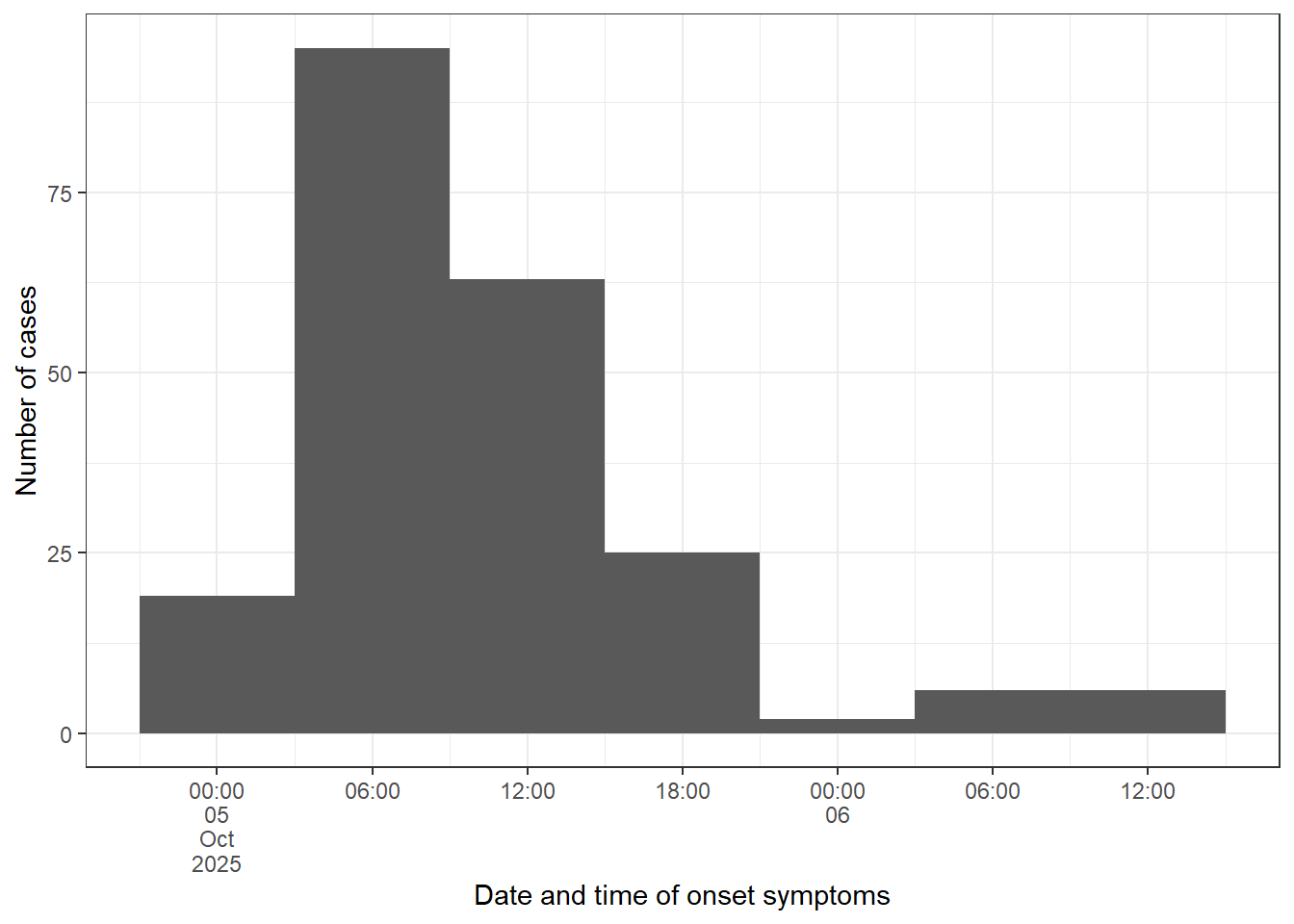 # Create a vector with sequences every 6h from the first to the last casebreaks_6h <-seq(from =min(cases$onset_datetime, na.rm =TRUE),to =max(cases$onset_datetime, na.rm =TRUE),by ="6 hours")# Fetch cases data:epicurve_datetime <- cases %>%# Add factor onset_datetime to ggplot aesthetic:ggplot(mapping =aes(x = onset_datetime)) +# Add geom_histogram:geom_histogram(# Apply the vector of requences created abovebreaks = breaks_6h) +# Adapt scale to data and adjust axis label angle:scale_x_datetime(date_breaks ="6 hours",labels =label_date_short()) +# Update x and y axis labels:labs(x ="Date and time of onset symptoms", y ="Number of cases") +# Remove unnecessary grid lines:theme_bw()# Print epicurve:epicurve_datetime