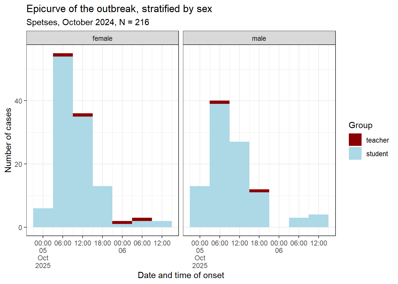 epicurve_strata <- cases %>%# Add factor onset_day to ggplot aesthetic:ggplot(mapping =aes(x = onset_datetime, fill = group)) +# Add nicer fill colours:scale_fill_manual(values =c("darkred", "lightblue")) +# Add geom_histogram:geom_histogram(# Apply the vector of requences created abovebreaks = breaks_6h) +# Adjust x axis scales to a suitable unit:scale_x_datetime(date_breaks ="6 hours", labels =label_date_short()) +# Update x and y axis labels:labs(x ="Date and time of onset", y ="Number of cases", fill ="Group", title ="Epicurve of the outbreak, stratified by sex",subtitle =str_glue("Spetses, October 2024, N = {sum(copdata$case)}")) +# Stratify by sex:facet_wrap(facets ="sex",ncol =2) +# Add theme:theme_bw()# Print epicurve:epicurve_strata