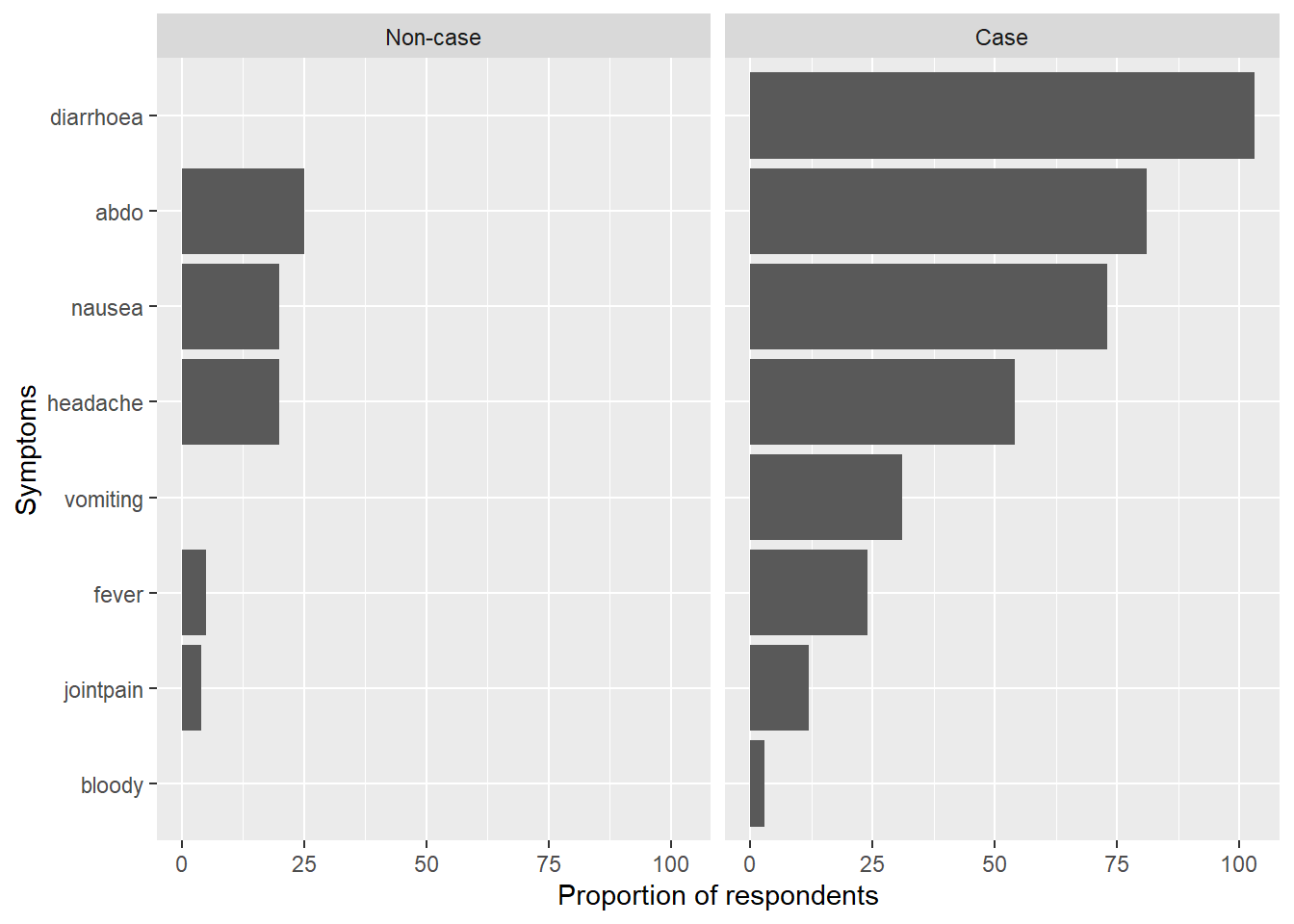 # Create list of symptom variables:symptoms <-c("diarrhoea", "bloody", "vomiting", "abdo", "nausea", "fever", "headache", "jointpain")# Create nice labels for case definition:caselabs <- ggplot2::as_labeller(c("0"="Non-case", "1"="Case"))# Select variables and cases:symptom_bar <- copdata %>%# Select symptom columns:select(case, c(all_of(symptoms))) %>%# Drop NAs:drop_na() %>%# Reshape (pivot longer):pivot_longer(!case, names_to ="Symptoms", values_drop_na =TRUE) %>%# Keep only TRUE values:filter(value =="1") %>%# Group by symptoms and case:group_by(Symptoms, case) %>%# Count for each symptom by case: dplyr::summarise(count =n()) %>%# Create plot:ggplot(mapping =aes(# Order symptom bars so most common ones are ontop:x =reorder(Symptoms, desc(count), decreasing =TRUE), y = count)) +# Display bars as proportionsgeom_bar(stat ="identity") +# Update x axis label:xlab("Symptoms") +# Update y axis label:ylab("Proportion of respondents") +# Flip plot on its side so symptom labels are clear:coord_flip() +# Facet the plot by (labelled) case:facet_wrap(facets ="case",labeller = caselabs,ncol =2)