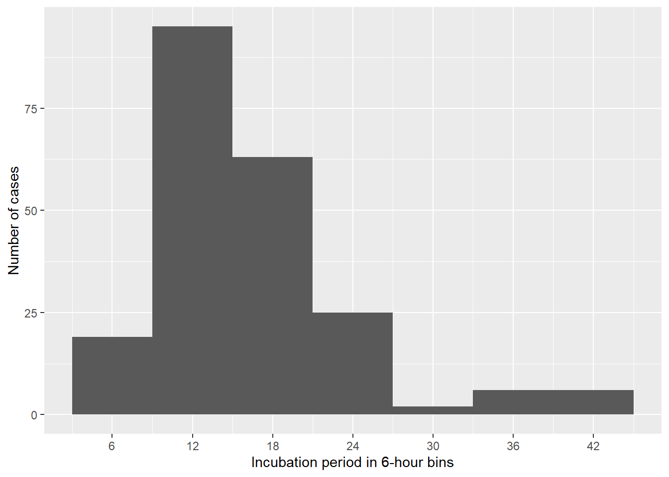 When constructing an epicurve, we need to decide on the resolution, i.e. the time interval for a single bar. A rule of thumb is to use one third or one fourth of the average incubation period as an interval. For our investigation this means we should use approximately a 6h interval.