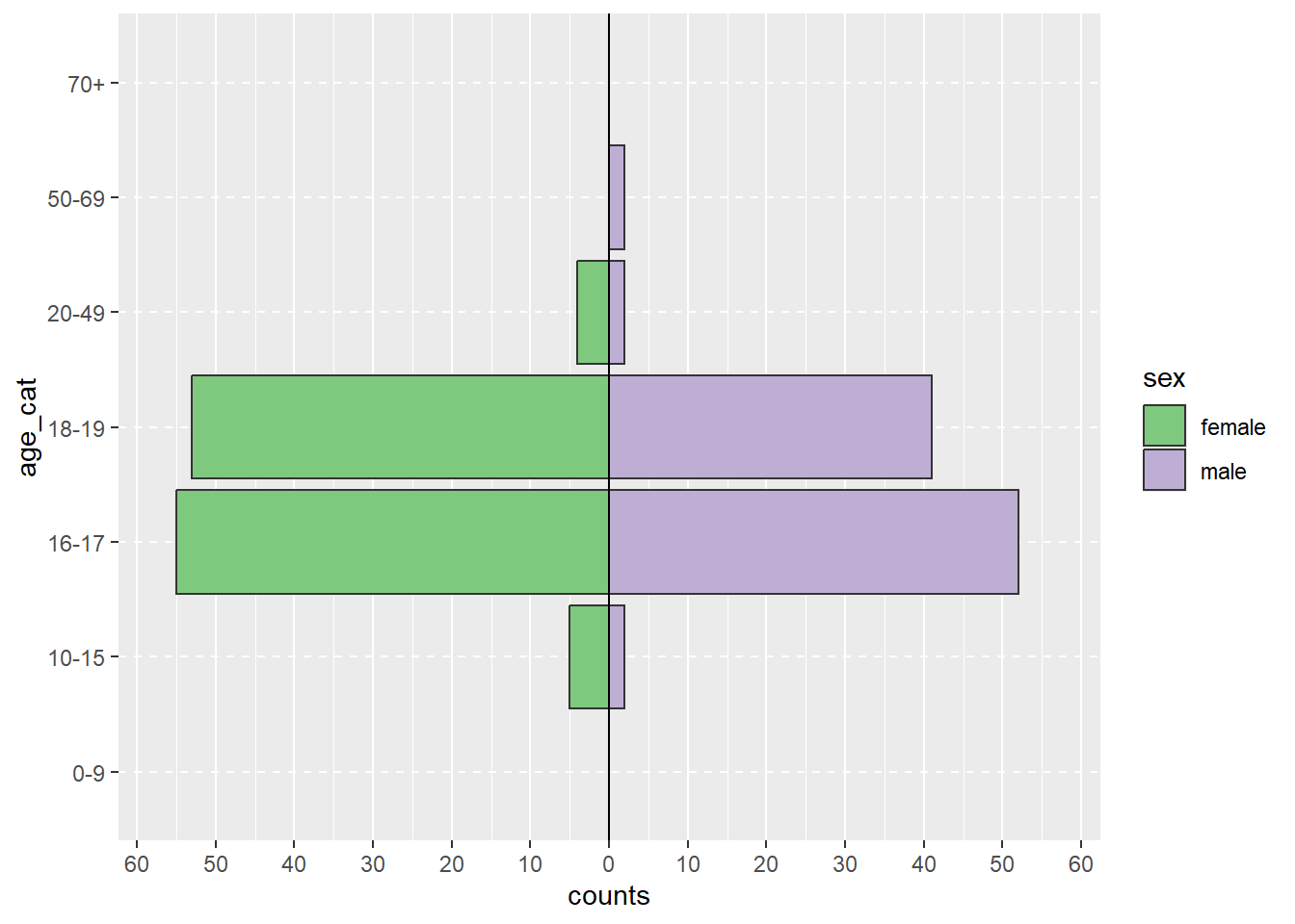 # Pipe copdata:agesex <- copdata %>%# Filter for cases only:filter(case ==TRUE) %>%# Create age sex pyramid: apyramid::age_pyramid(# Specify column containing age categories:age_group ="age_cat",# Specify column containing sex:split_by ="sex", # Don't show midpoint on the graph:show_midpoint =FALSE )# Print plot:agesex
